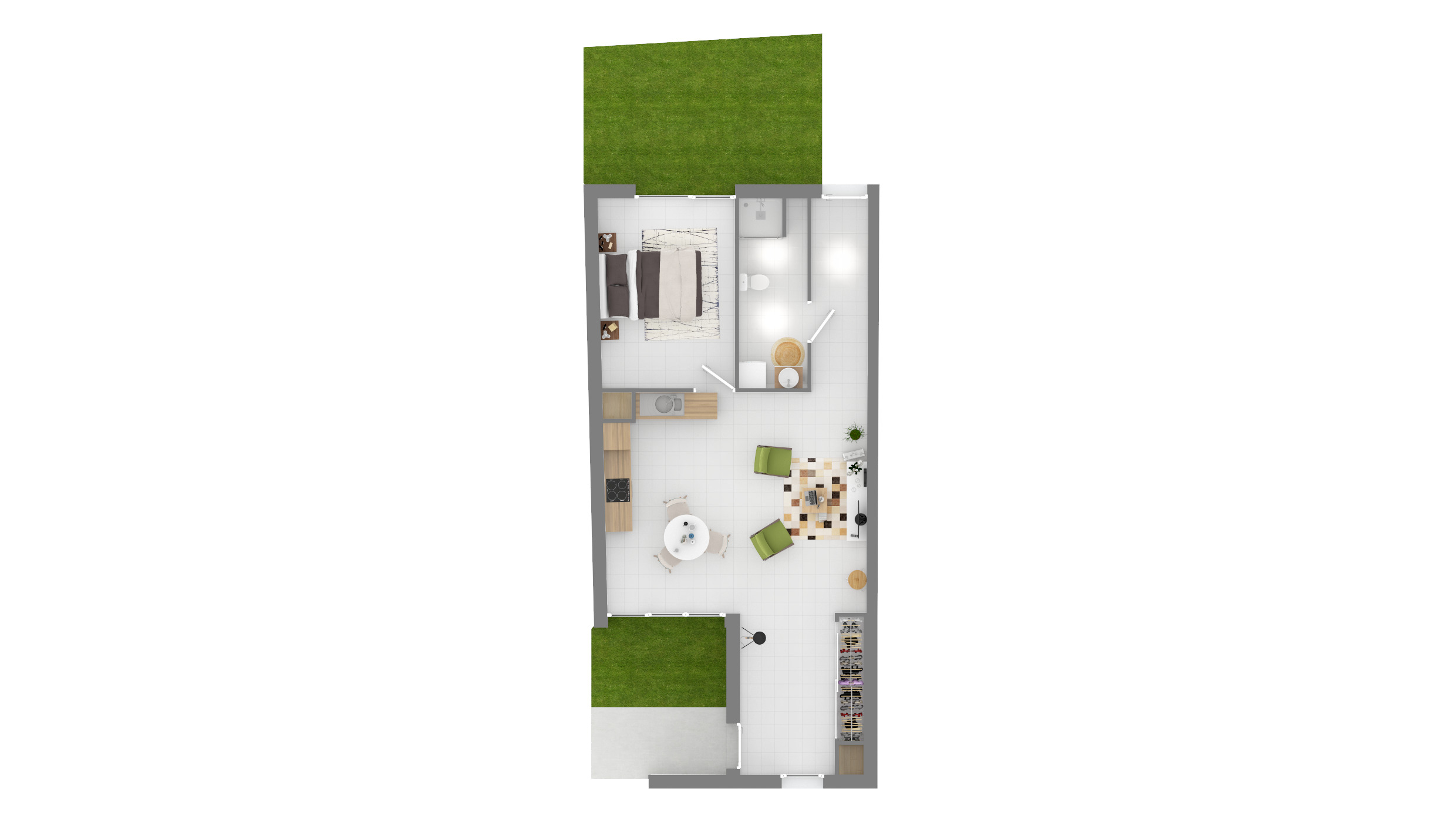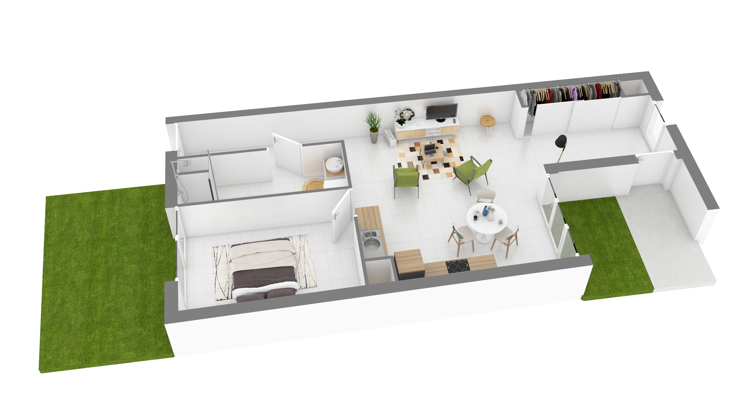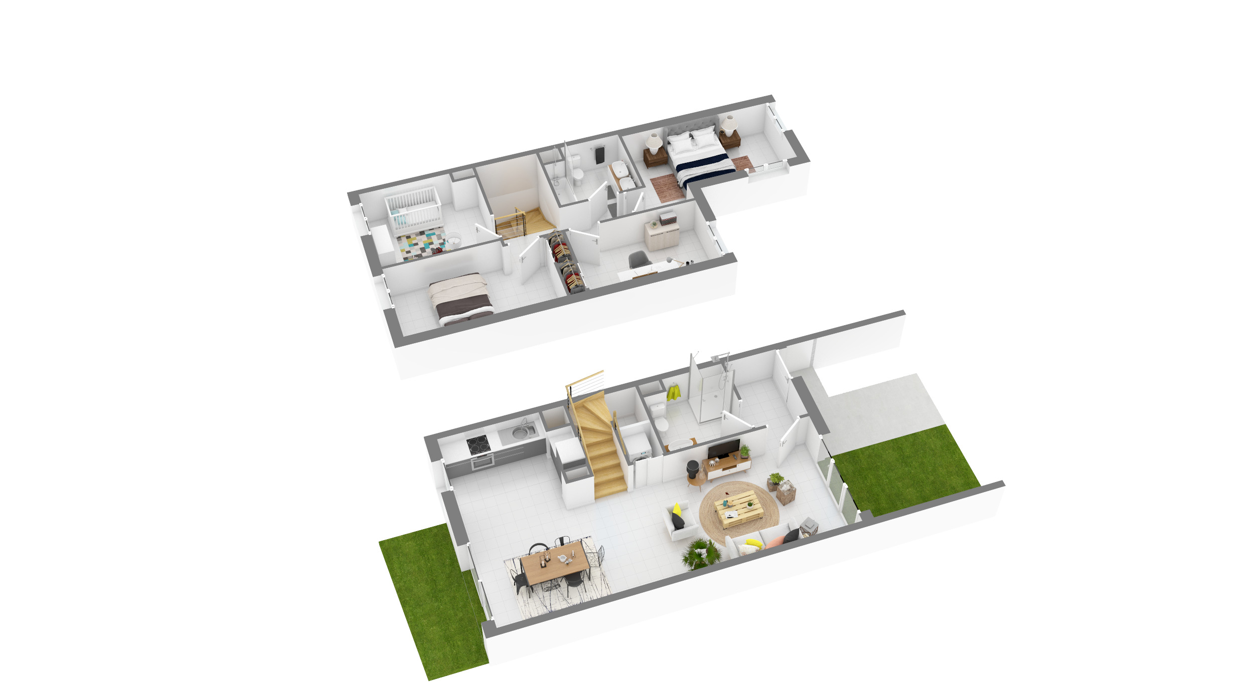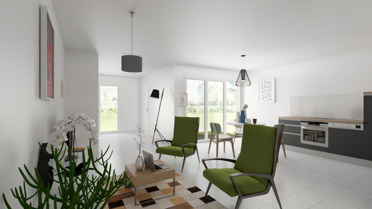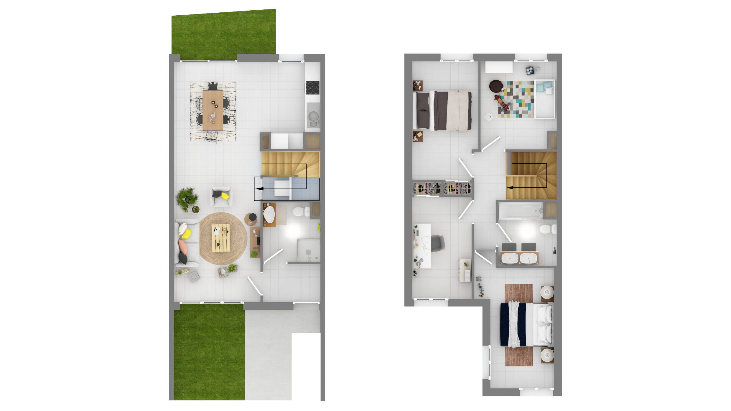 Les maisons en R+1 sont idéalement agencées avec un spacieux séjour cuisine et quatre chambres allant de 10 à 13m². Chaque maison est prolongé d’un espace extérieur de 16m².