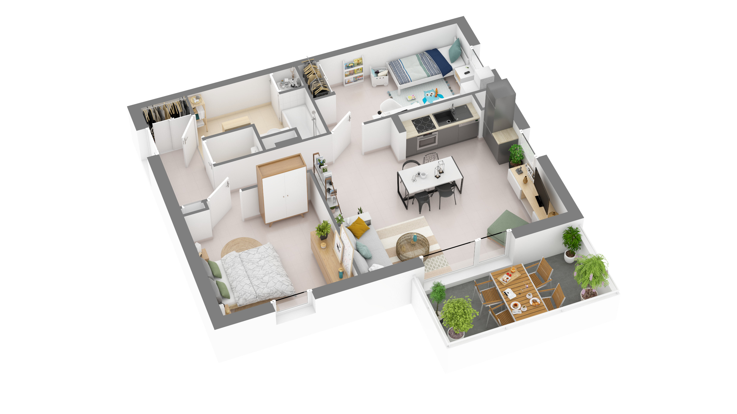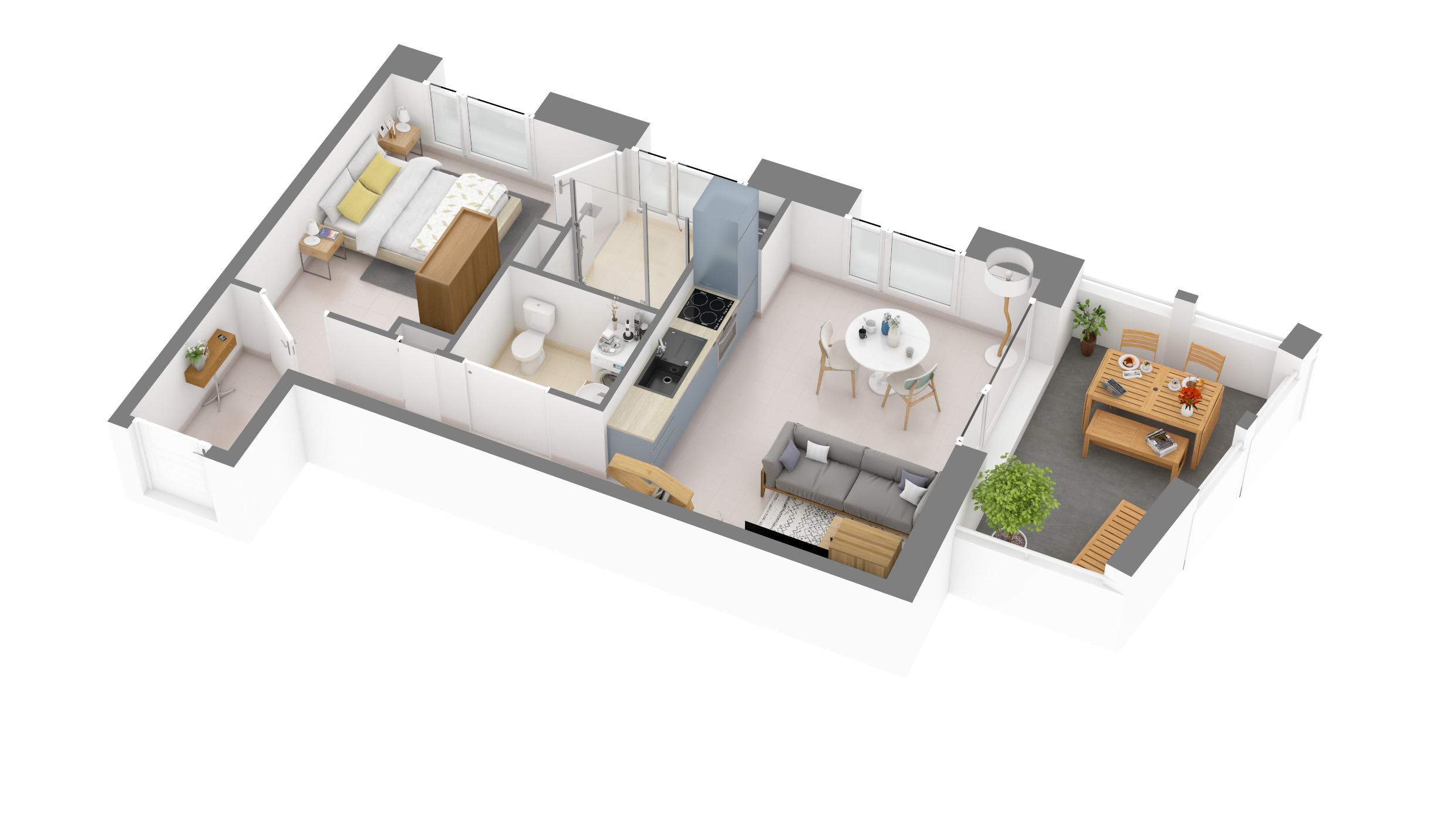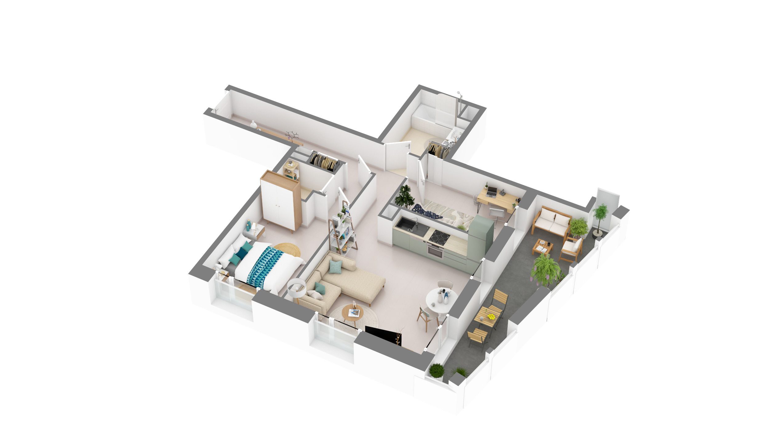 Du T2 au T3, les appartements jouissent de prestations intérieures de qualité et bénéficient d'espaces extérieurs privatifs sous la forme d'un balcon ou d'une terrasse donnant sur le calme d'une promenade arborée.