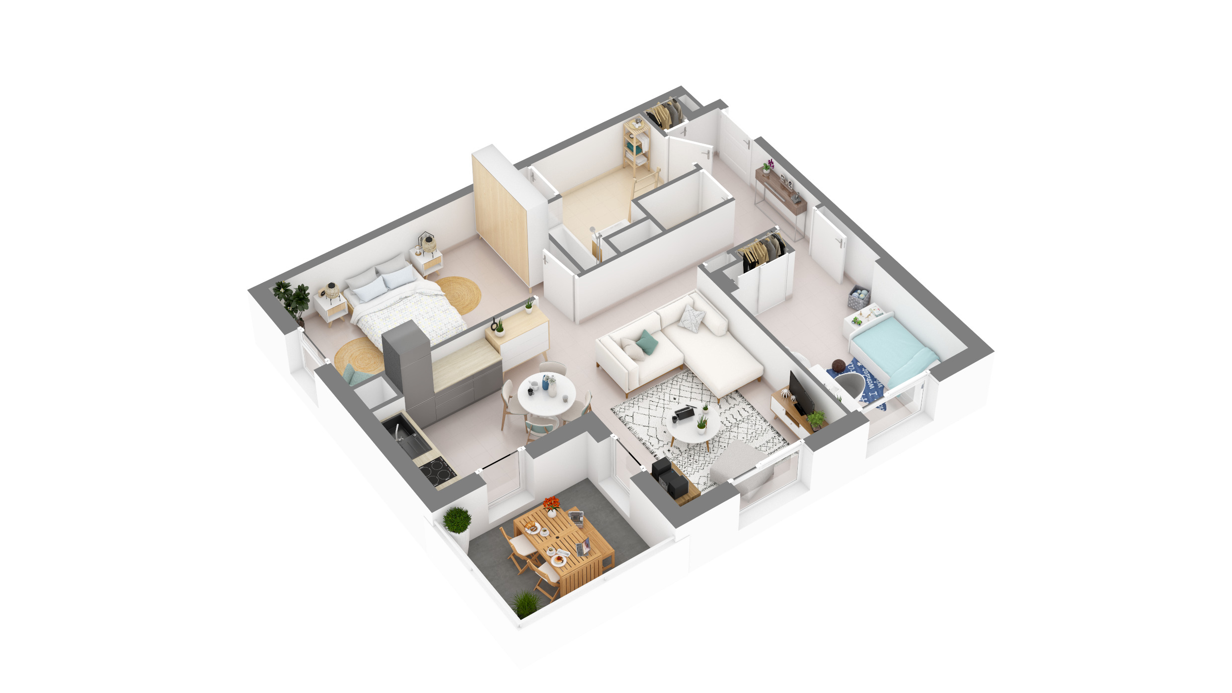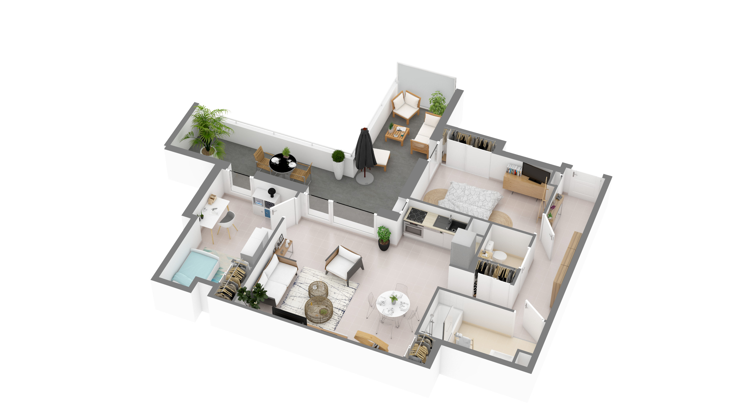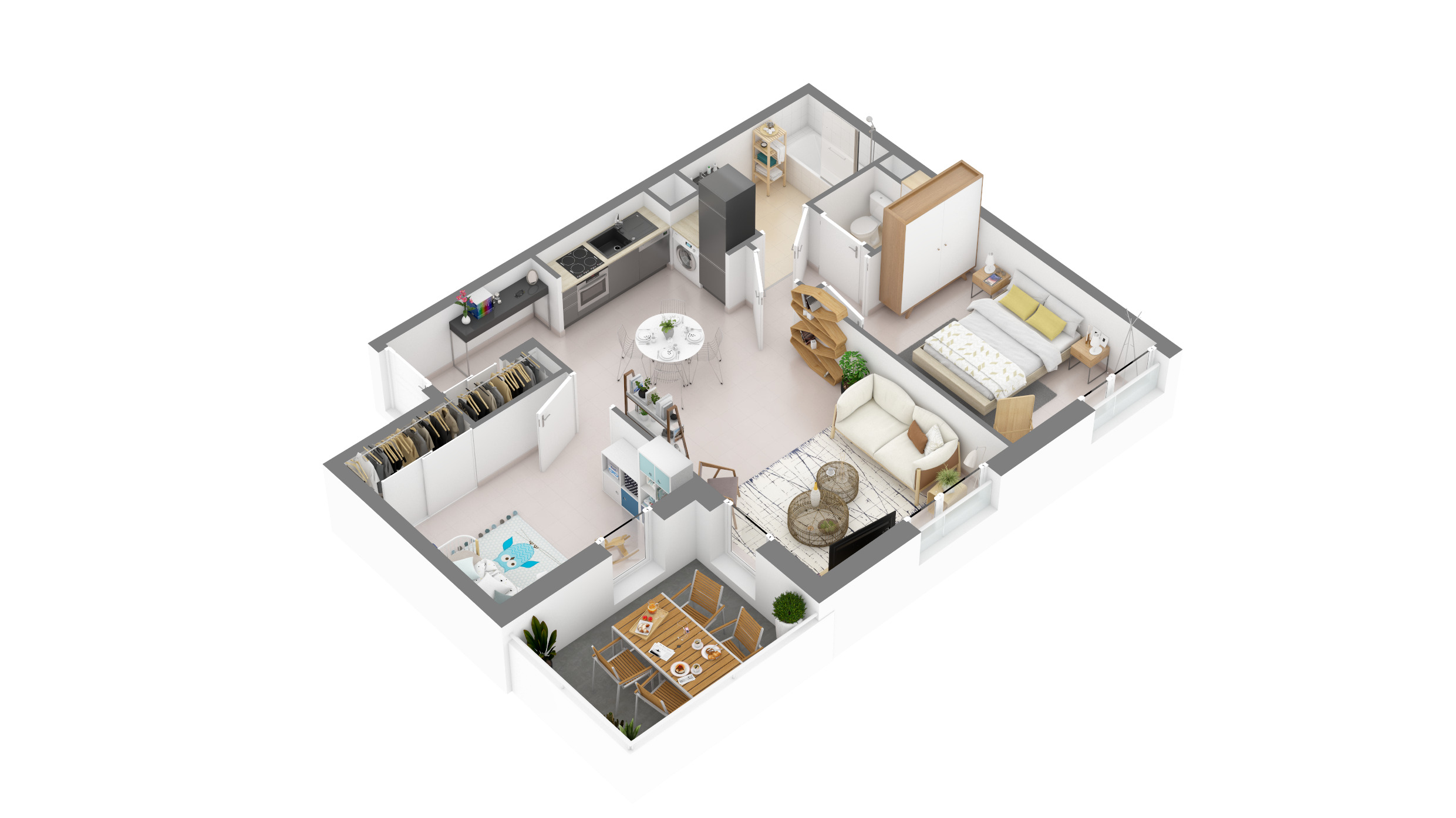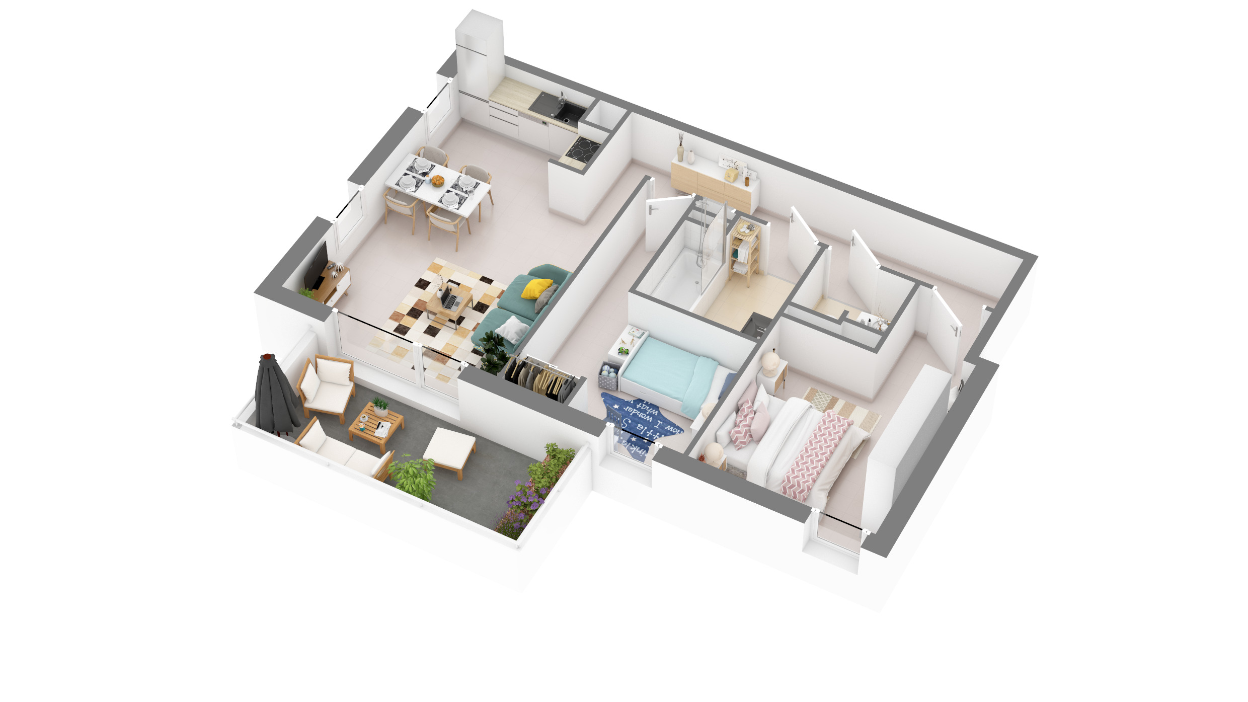 Du T2 au T3, les appartements jouissent de prestations intérieures de qualité et bénéficient d'espaces extérieurs privatifs sous la forme d'un balcon ou d'une terrasse donnant sur le calme d'une promenade arborée.