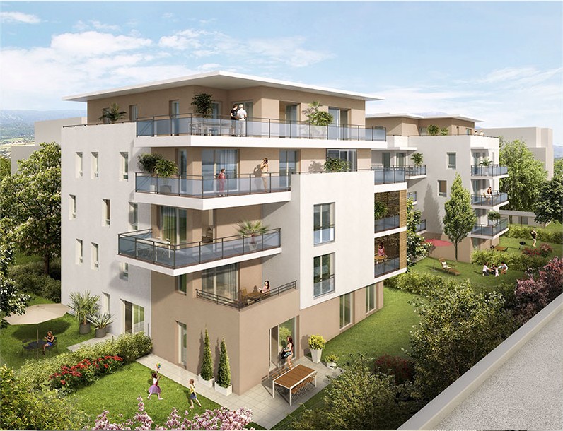 Résidence de standing en copropriété composée de petits bâtiments avec ascenseur.